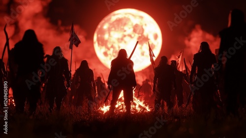 In darkness of night circle of pagans gathers around towering bonfire dancing and celebrating arrival of spring illuminated glow of full moon above.
