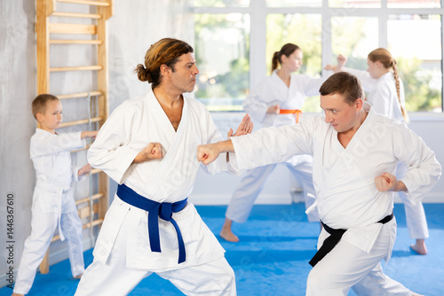 In gym, Man father in kimono learns to fight and, paired with male teacher, practices striking. Family karate coach conducts classes for parents and children