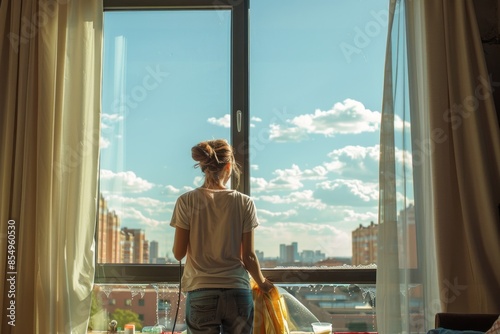 In her apartment, a woman carefully washes the windows, using a cloth and cleaning solution to remove dirt and streaks, creating a clearer view and a fresher environment