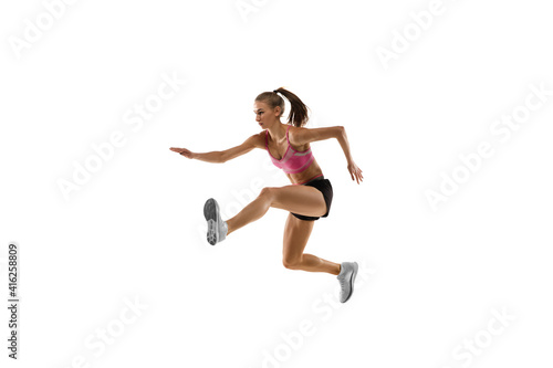 In jump. Caucasian professional female athlete, runner training isolated on white studio background. Muscular, sportive woman. Concept of action, motion, youth, healthy lifestyle. Copyspace for ad.