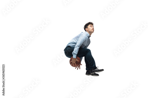 In jump. Man in office clothes playing basketball on white background like professional player, sportsman. Unusual look for businessman in motion, action with ball. Sport, healthy lifestyle