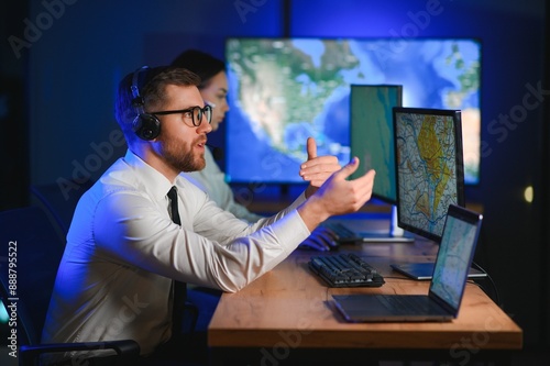In Monitoring Room Technical Support Specialist Speaks into Headset. His Colleagues are Working in the Background