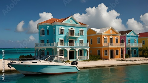 In Nassau, Bahamas, a serene summer day scene features a boat, the ocean, colorful houses, and a hotel.