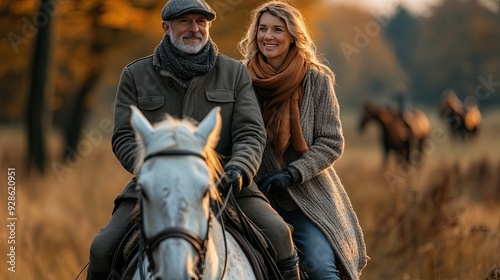 In nature, a senior couple is riding horses.