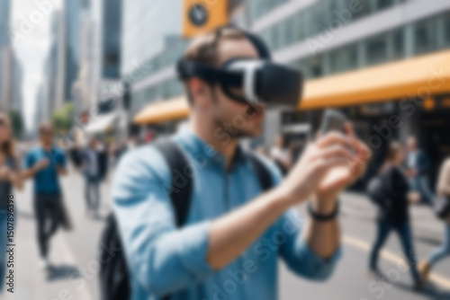 In public, blurry photo of a man using VR headset on public street, exploring virtual reality. Technology, metaverse, learning, innovation, interactive, blurry wallpaper.