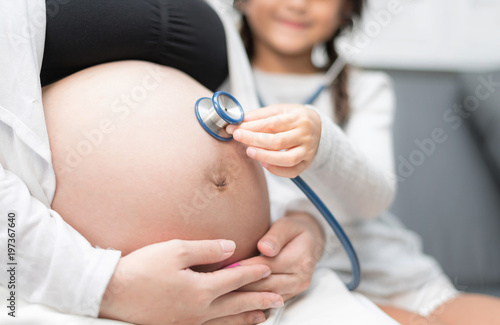 In Selective Focus Of Happy Family Checking New Baby In The Morning.Close Up Of A Beautiful Happy Pregnant Woman With Big Belly. Pregnancy And Motherhood Moment People And Expectation Concept.
