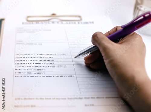 In selective focus of Pen was holding by human hand,signing on the Insurance Claim form,fill the information,blurry light around