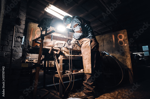 In the dark metal factory busy man is working on his workplace.