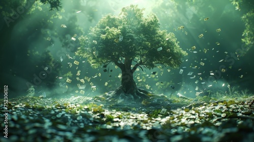 In the enchanted woods, a vibrant money tree flourished, its branches adorned with colorful Monopoly bills.