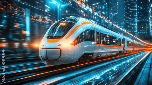 In the evening, a high-speed train travels between high-rise buildings in the city