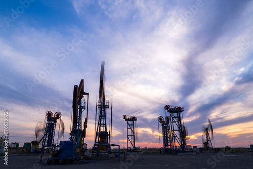 in the evening, oil pumps are running, The oil pump and the beautiful sunset reflected in the water, the silhouette of the beam pumping unit in the evening.