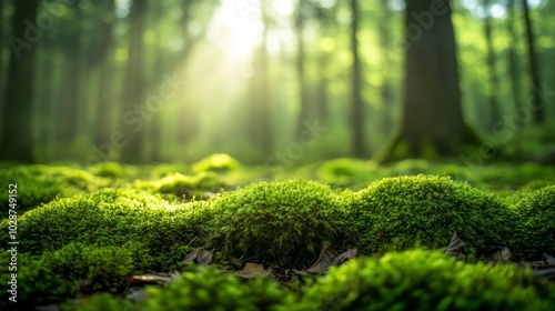 In the forest, moss grows on tree trunks and roots, and there is sunlight shining through the trees in an endless green pine forest.