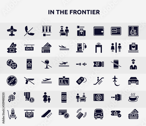 in the frontier filled icons set. glyph icons such as airliner, airport check in, ticket card, no drinks, luggage tag, receipt with dollar, qr code scan, exit, credit cards accepted icon.