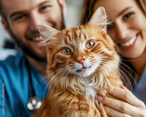 In the light-filled clinic office, a caring male veterinarian engages a smiling couple in a detailed discussion about pet insurance options The warm, professional atmosphere is palpable as they