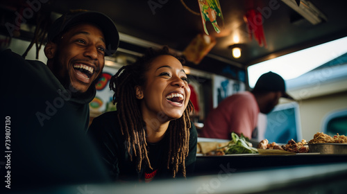 In the midst of a bustling street food truck market, a joyful mix of multiracial individuals come together to savor the culinary delights on offer