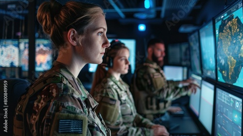 in the military control room A soldier sits with headphones on and looks at a laptop screen.
