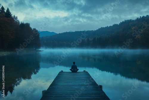 In the quiet of twilight, a single person meditates on a dock, surrounded by the tranquil scenery of a misty lake, mountains, and forests, embracing peace and mindfulness
