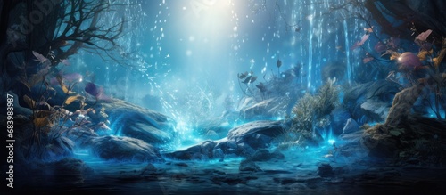 In the serene embrace of nature, a vibrant blue liquid cascades down, each drop forming a mesmerizing splash as it meets the wet ground, splashing in a symphony of water.