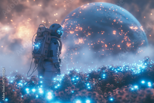 In the stillness of an alien landscape, an astronaut contemplates the beauty of a vibrant planet nearby.