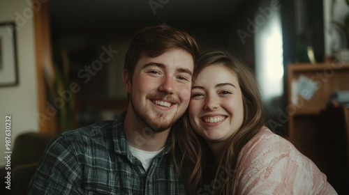 In their home, a young couple smiles for a cozy and intimate portrait.