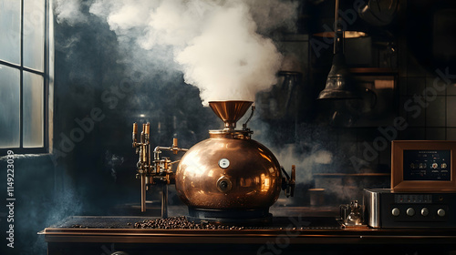 In this artisanal coffee roasting, a vintage copper roaster filled with coffee beans generates warm light aromatic smoke that swirls upward, capturing the craftsmanship and tradition of small-batch