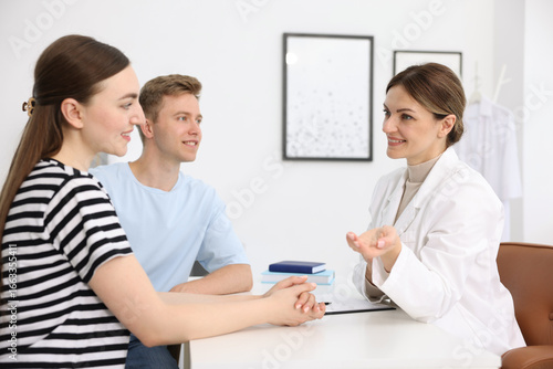 In vitro fertilization (IVF). Happy couple having appointment with doctor in reproductive clinic