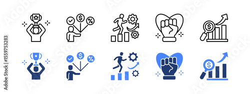 Incentive icon set with Achievement, Employee benefits, Productivity, Empowerment, Financial analysis . editable stroke icon set.