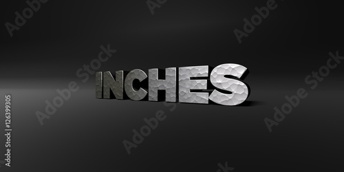 INCHES - hammered metal finish text on black studio - 3D rendered royalty free stock photo. This image can be used for an online website banner ad or a print postcard.