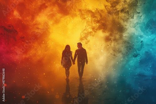 Inclusive Couple diverse couple holding hands, surrounded rainbow aura, celebrating love