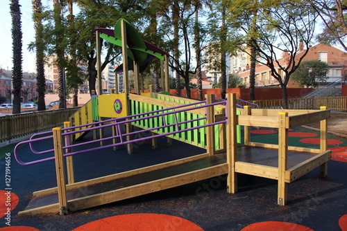 Inclusive playground for children with functional diversity and physical disabilities. Ramp leading up to the play area with bright and fun colours. Rubber flooring with geometric shapes.