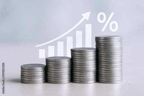 Increasing business growth chart with stacked coins and upward arrow symbol.
