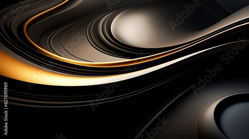 Incredible fantasy black and gold background. The texture of stucco, a wall with curves and inversions of black plastic, and mirror surfaces. AI generation