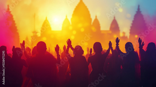 Independence Day Celebration With Silhouetted Monument and People Rejoicing at Sunset Representing National Pride, Unity, and the Spirit of Liberation With Cultural and Historical Significance