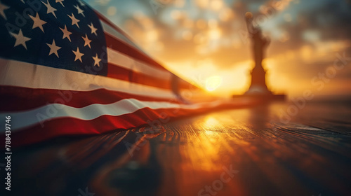 Independence Day inspiration with the American flag and Statue of Liberty at sunset.