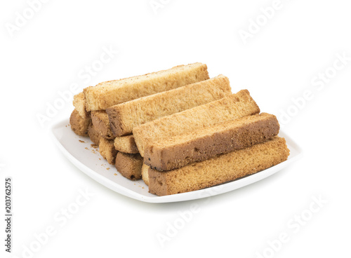 Indian Bakery Food Tea Time Sweet Dry Toast Snack Also Know As Indian Toast Snack, Toasted, Bread, Long Toast, Mawa Toast isolated on White Background