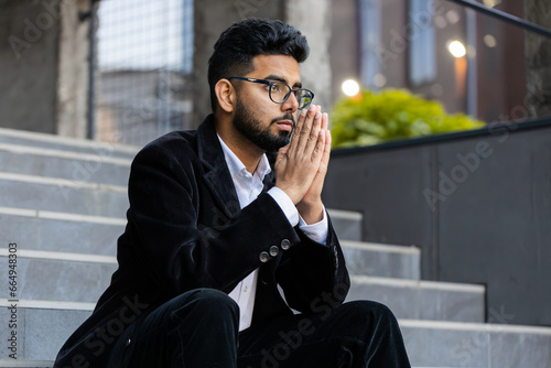 Indian businessman clasping hands wishing luck praying to God asking blessing help forgiveness wish luck outdoor. Arabian Hindu freelancer guy in downtown city street. Business people lifestyle