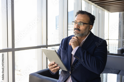 Indian businessman holding tablet, looks out window with thoughtful expression