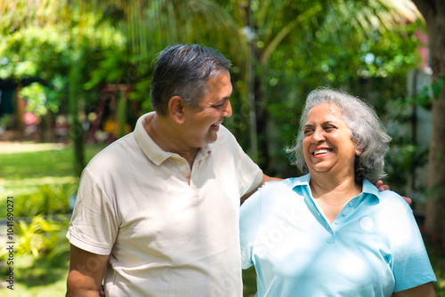 Indian couple in their fifties walking in the park, smiling and discussing with gestures