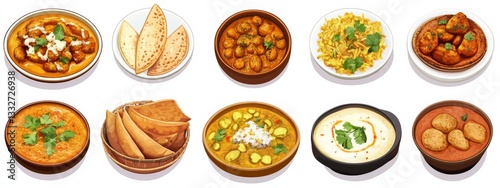 Indian Cuisine Flatlay Diverse Dishes, Top View, Illustration, Food Photography, Indian Food Indian food, flatlay