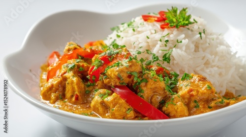Indian curry with rice served in bowl-shaped plate, bright colors, white studio backdrop