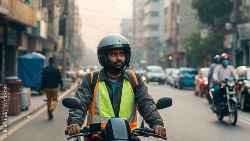 Indian Delivery Worker on Motorcycle in City Traffic – A courier riding a motorbike, weaving through a busy urban street with vehicles and shops in the background.