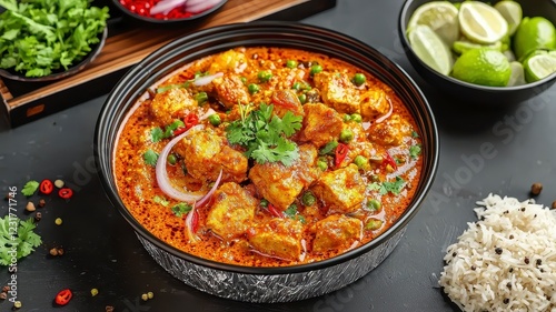 Indian dishes curry street food concept. A vibrant bowl of curry with tender chunks of meat, garnished with herbs and spices, served alongside rice and fresh lime.