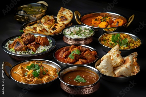 Indian Dishes with Lamb Curry, Vegetable Samosas, and Rich Flavors on Black Background