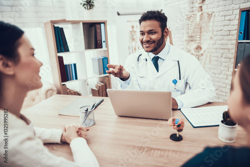 Indian doctor seeing patients in office. Doctor is using laptop at table.