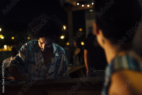 Indian ethnicity with afro hair DJ controlling equipment and people dancing in a tropical party in the caribbean in Santa Marta, Colombia