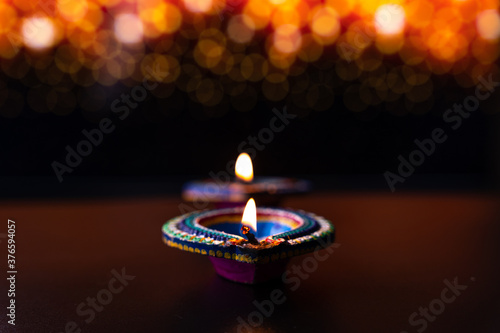 Indian festival Diwali, Diya oil lamps lit on colorful rangoli. Hindu traditional. Happy Deepavali. Copy space for text.