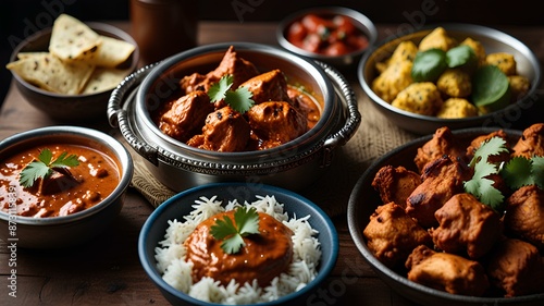 indian food feast with chicken tikka masala curry.
