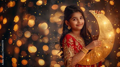 Indian girl in anarkali suit, holding big golden crescent moon-shaped board, lighting background for festival celebration