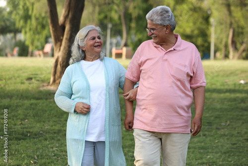 Indian happy senior beautiful couple embracing tohether and looking romantic and close together in garden