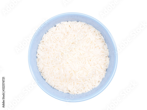 Indian long grain Basmati rice in blue ceramic bowl isolated on white. Indian cuisine, ayurveda, naturopathy concept